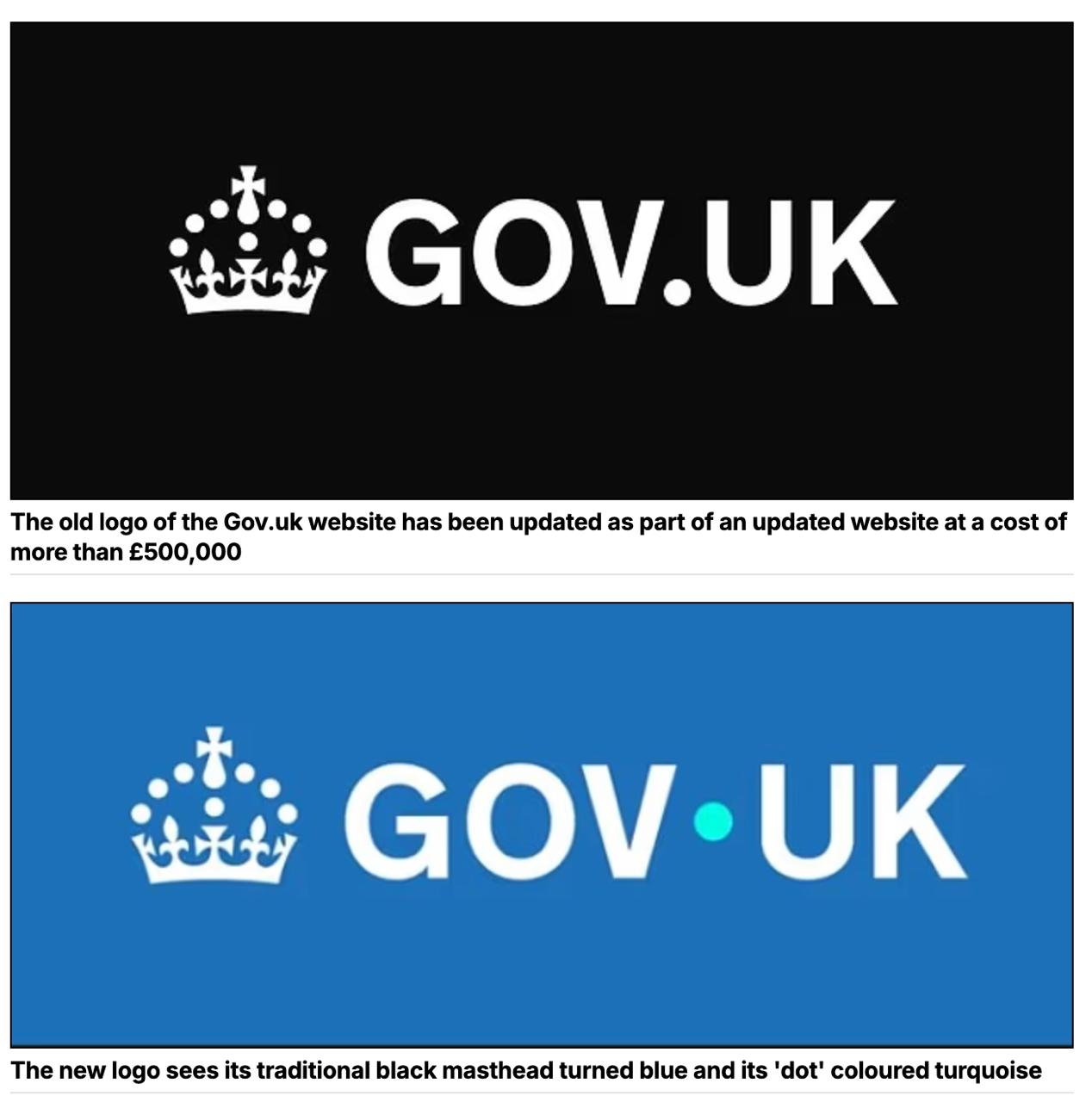 Власти Великобритании потратили 532 000 фунтов стерлингов на минимальный редизайн логотипа правительственного сайта gov.uk. Черный логотип сделали синим, а точку - бирюзовой и разместили чуть выше, чем на старом варианте.