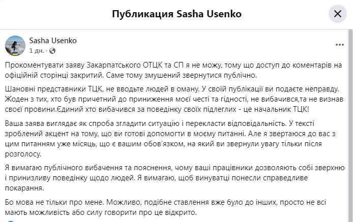 "Прокомментировать заявление Закарпатского ОТЦК и СП я не могу, потому что доступ к комментариям на официальной странице закрыт. Именно поэтому вынужден обратиться публично. Уважаемые представители ТЦК, не вводите людей в заблуждение. В своей публикации вы солгали. Ни один из тех, кто был причастен к унижению моей чести и достоинства, не извинился, не признал своей вины. Единственный извинившийся за поведение своих подчиненных - это начальник ТЦК! Ваше заявление выглядит как попытка сгладить ситуацию и переложить ответственность... Я требую публичного извинения и объяснения, почему ваши работники позволяют себе высокомерное и унизительное поведение в отношении людей. Я требую, чтобы виновные понесли справедливое наказание", - написал Усенко.