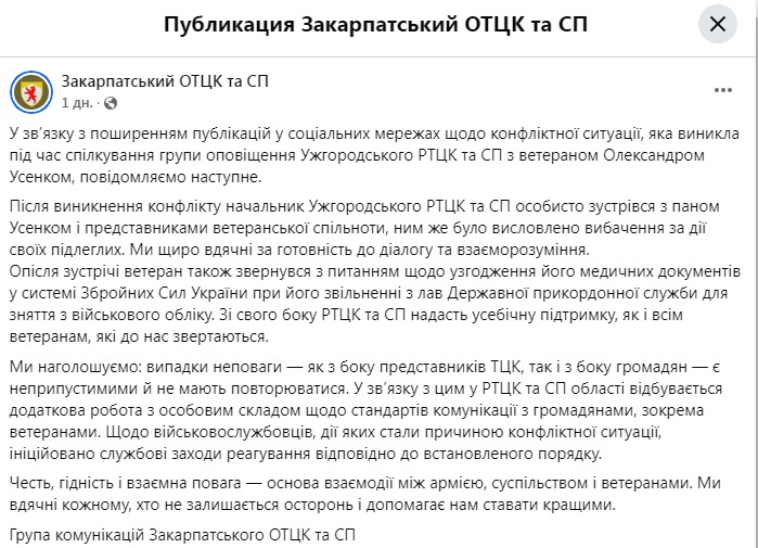 После резонанса в соцсетях Закарпатский ОТЦК в том же Фейсбуке сообщил, что начальник Ужгородского РТЦК и СП встретился с Усенко и представителями ветеранского сообщества и извинился за действия своих подчиненных.