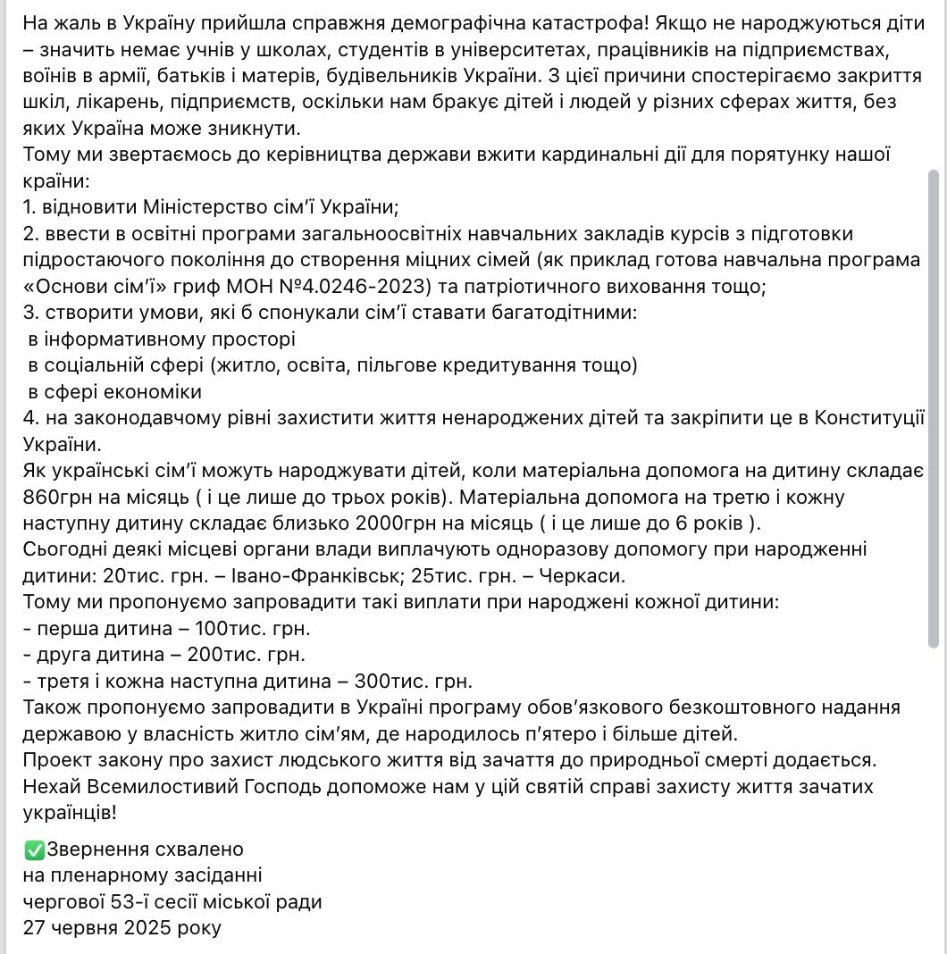 В документе обращается внимание на критическую демографическую ситуацию в стране, связанную с войной, миграцией и большим количеством разводов. Из-за этих факторов коэффициент рождаемости в стране составляет 0,7 при допустимом 2,13 на семью.