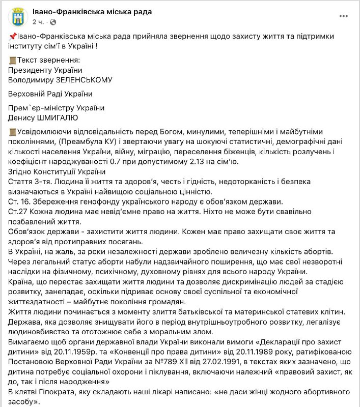 Ивано-Франковский городской совет принял обращение к Владимиру Зеленскому, Верховной Раде и премьер-министру Денису Шмыгалю о защите жизни и поддержке института семьи в Украине. Горсовет призывает власти страны "на законодательном уровне защитить жизнь нерожденных детей и закрепить это в Конституции Украины". Иными словами - запретить аборты.