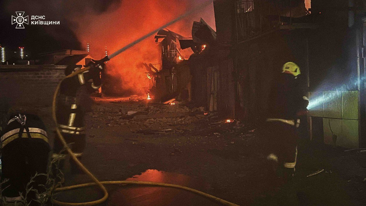 В Святошинском районе из-за падения обломков беспилотников на склады начался пожар. Обломки дронов упали также во двор 16-ти этажного жилого дома, из-за чего загорелись автомобили, также возник пожар в частном секторе.