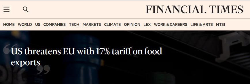 По информации издания, требование было озвучено на встрече с еврокомиссаром по торговле Марошем Шефчовичем в Вашингтоне и передано всем 27 странам ЕС. Также в случае провала переговоров США грозят распространить 20-процентные пошлины на весь европейский экспорт.