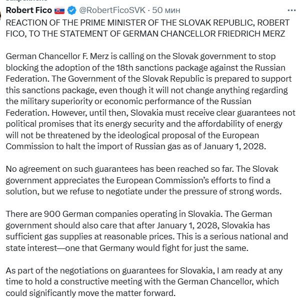 "Канцлер ФРГ Фридрих Мерц призывает правительство Словакии прекратить блокирование принятия 18-го пакета санкций против Российской Федерации. Правительство Словацкой Республики готово поддержать этот пакет, даже если он ничего не изменит в военном превосходстве или экономических показателях Российской Федерации. Однако до тех пор Словакия должна получить четкие гарантии, а не политические обещания, что ее энергетическая безопасность и доступность энергоносителей не будут поставлены под угрозу идеологическим предложением Европейской комиссии о прекращении импорта российского газа с 1 января 2028 года. До сих пор соглашение о таких гарантиях не достигнуто. Правительство Словакии ценит усилия Европейской комиссии по поиску решения, но мы отказываемся вести переговоры под давлением резких высказываний", – заявил Фицо.