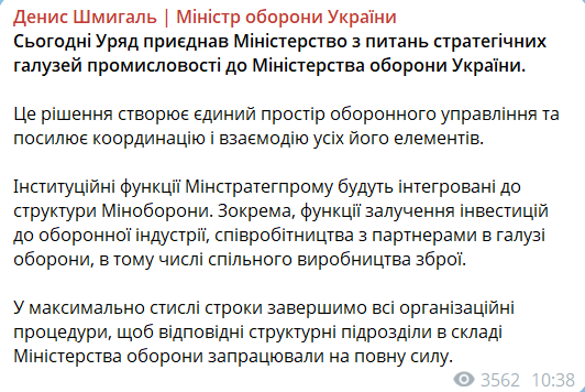 Минстартегпром присоединили к Минобороны, сообщил глава ведомства Денис Шмыгаль.