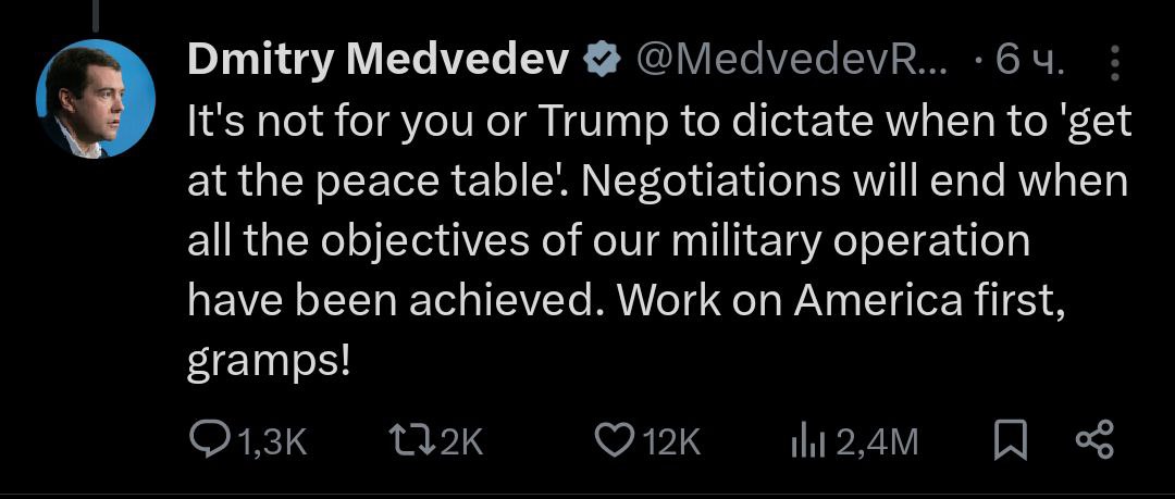 "Переговоры завершатся, когда все цели нашей военной операции будут достигнуты. Займитесь Америкой прежде всего, дедуля!" — написал замглавы Совбеза РФ.