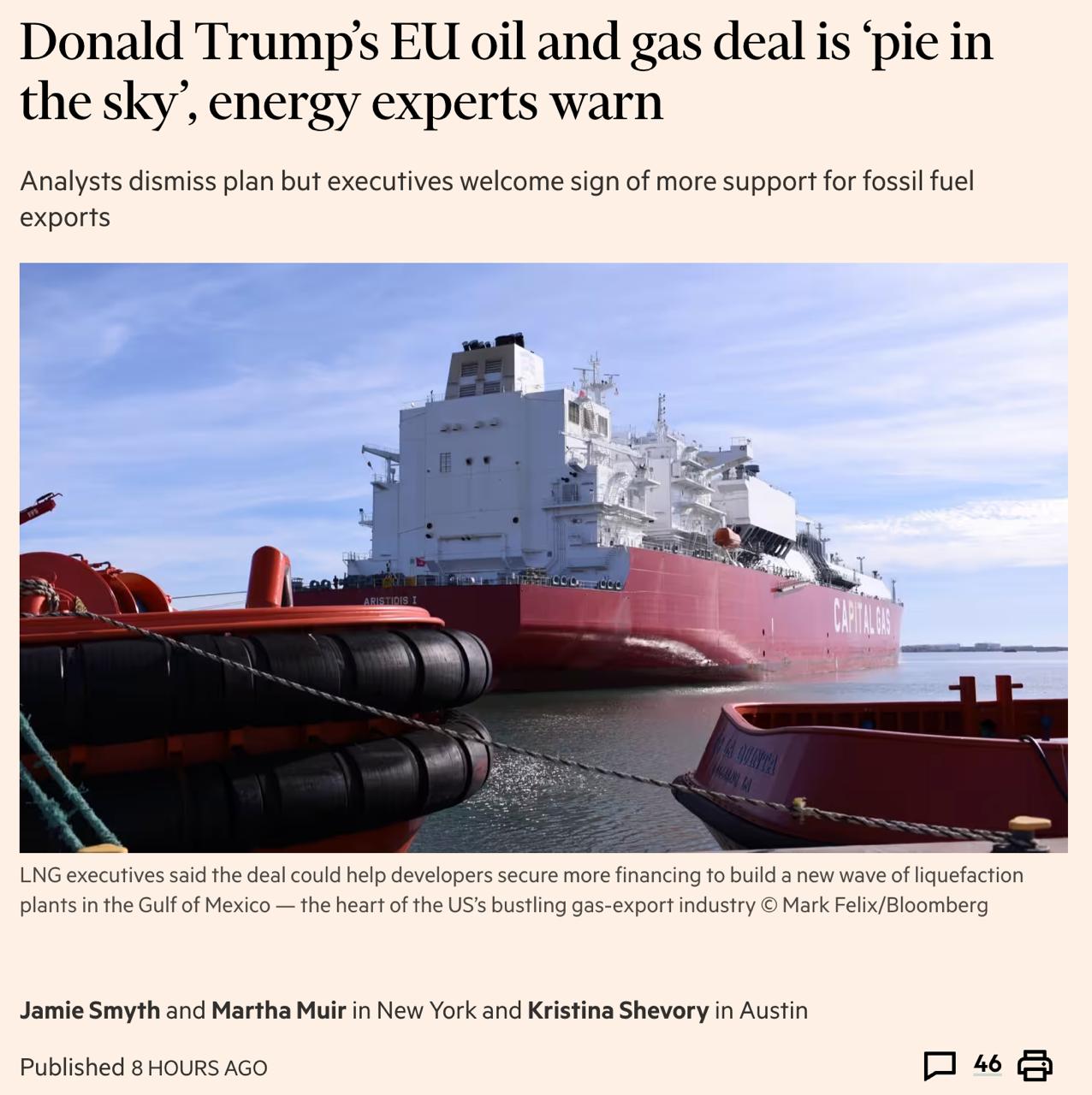 "Даже если бы Европа захотела увеличить свой импорт, я не знаю механизма, с помощью которого ЕС обратится к компаниям и прикажет им покупать больше американской энергии. Компании несут ответственность перед своими акционерами и обязаны покупать самое дешёвое сырьё", — сказал Мэтт Смит из консалтинговой фирмы Kpler.