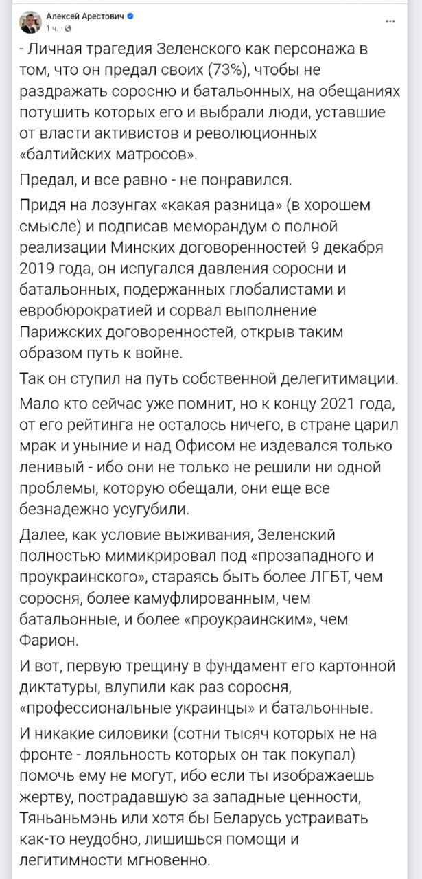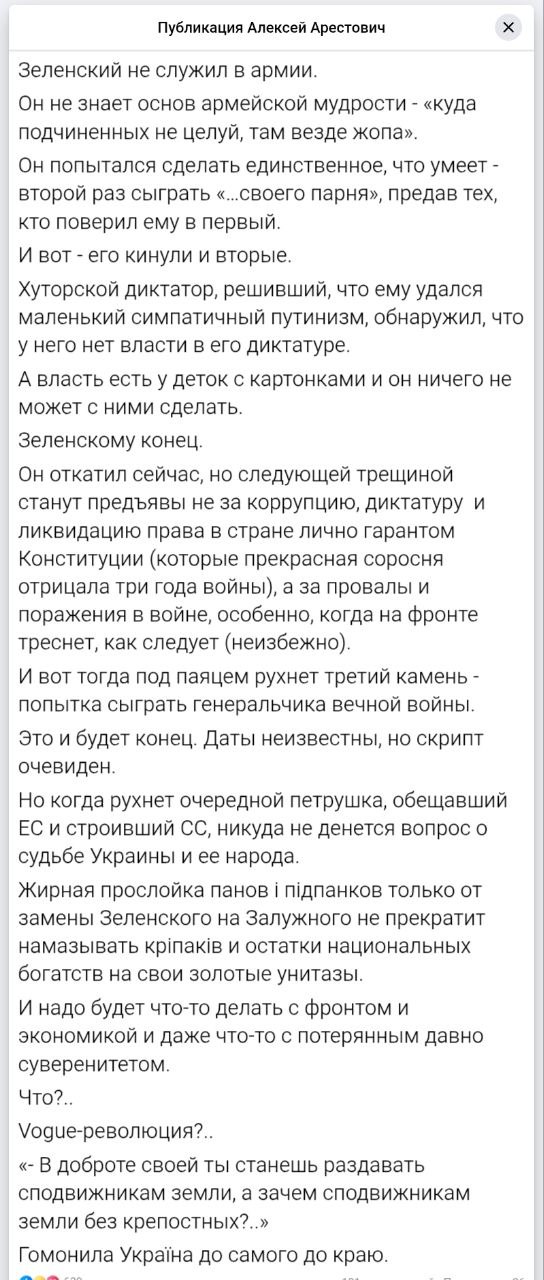 "Он откатил сейчас (возвратив полномочия НАБУ - Ред.), но следующей трещиной станут предъявы не за коррупцию, диктатуру и ликвидацию права в стране лично гарантом Конституции (которые прекрасная соросня отрицала три года войны), а за провалы и поражения в войне, особенно когда на фронте треснет как следует (неизбежно). И вот тогда под паяцем рухнет третий камень - попытка сыграть генеральчика вечной войны.  Это и будет конец. Даты неизвестны, но скрипт очевиден", - предрек Арестович.