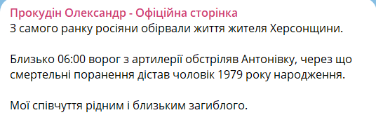 08:10 Утром россияне из артиллерии обстреляли Антоновку Херсонской области. Смертельные ранения получил мужчина 1979 года рождения, сообщает глава ОВА Прокудин.