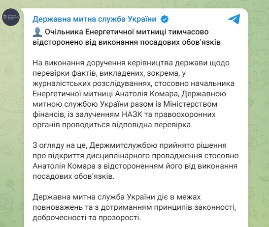 "Во исполнение поручения руководства государства относительно проверки фактов, изложенных, в частности, в журналистских расследованиях, в отношении начальника Энергетической таможни Анатолия Комара, Государственной таможенной службой Украины вместе с Министерством финансов, с привлечением НАПК и правоохранительных органов проводится соответствующая проверка. Учитывая это, Гостаможслужба приняла решение об открытии дисциплинарного производства в отношении Анатолия Комара с отстранением его от исполнения должностных обязанностей", - сказано в публикации.