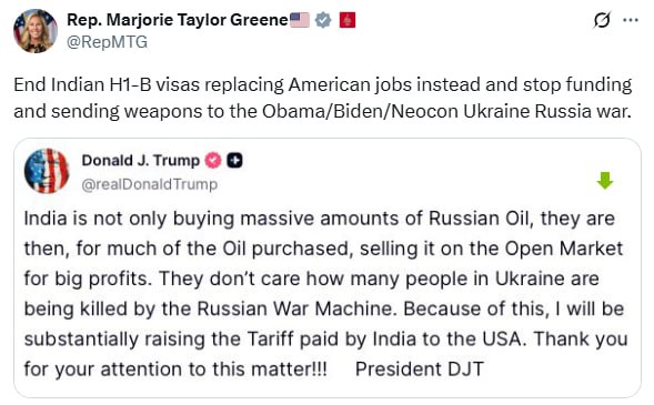 Конгрессвумен Марджори Тейлор Грин в ответ на заявление Дональда Трампа о введении пошли в отношении Индии призвала прекратить финансировать Украину.