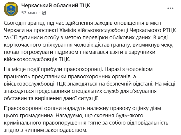 В Черкассах мужчина, которого ТЦК остановили для проверки военных документов, достал гранату и выдернул чеку.