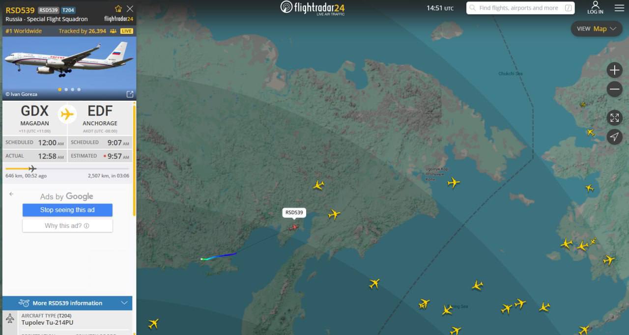 Тем временем самолет Путина уже направляется на Аляску из Магадана. Весь путь займет около 4 часов.