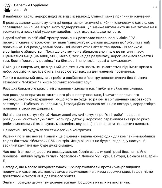 "Пока что системно не сбивают ночью, но это вопрос времени. Подниматься выше (на 4000, 5000 метров) тоже не дает результата, враг научился сбивать и там. Вести секторную разведку на большинстве направлений пока что невозможно", - написал Гордиенко.