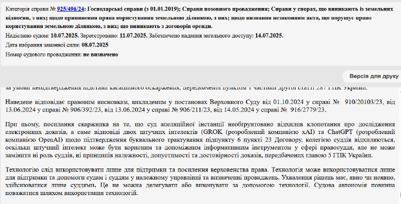 Верховный суд Украины постановил, что ответы ИИ не могут быть достоверным доказательством