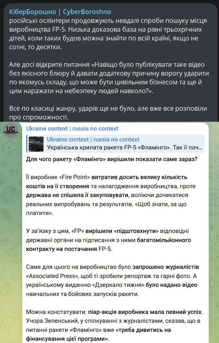 При этом в украинских телеграм-каналах пишут, что пригласить журналистов на производство и опубликовать эти кадры решила сама компания-производитель в целях саморекламы, поскольку государство не торопилось заказывать ракеты. В связи с этим "компания и решила подтолкнуть государственные органы на подписание с ней многомиллионного контракта на поставки ракет". Для этого сделали фото ракеты, также дали СМИ видео ее запуска.