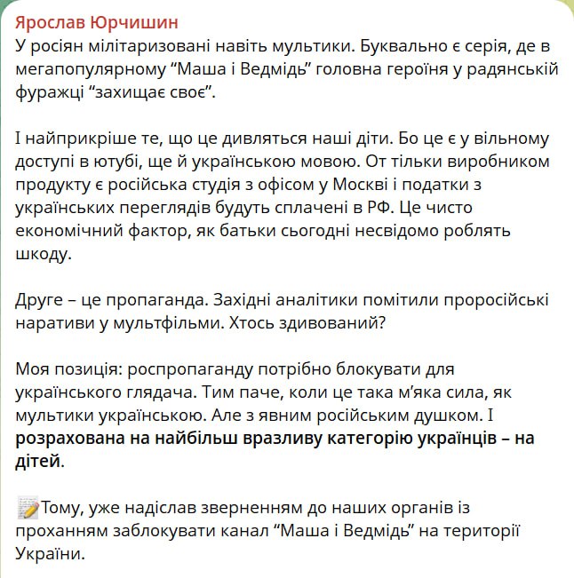 Народный депутат Ярослав Юрчишин обратился в Совет национальной безопасности и обороны Украины и Службу безопасности Украины с предложением заблокировать канал с мультфильмом "Маша и Медведь".