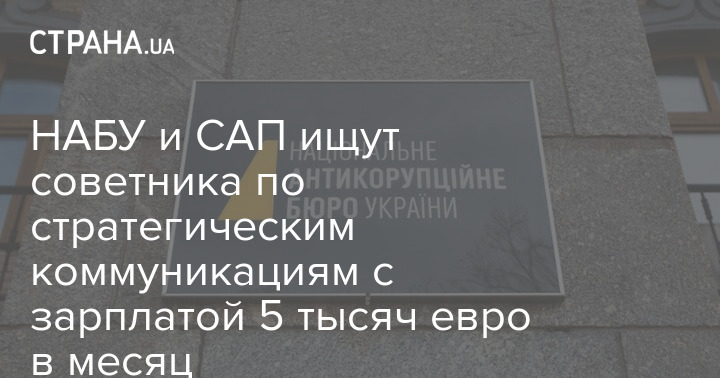 Национальное антикоррупционное бюро Украины и Специализированная антикоррупционная прокуратура объявили о поиске специалиста на должность старшего советника по стратегическим коммуникациям. Ведомства обещают зарплату в размере пяти тысяч евро в месяц.