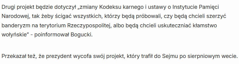 Проект будет касаться "внесения изменений в Уголовный кодекс и Закон об Институте национальной памяти, чтобы привлечь к ответственности всех тех, кто пытается или хочет распространять бандеровщину на территории Республики Польша или хочет увековечить ложь о Волынской резне", – сказал Богуцкий.