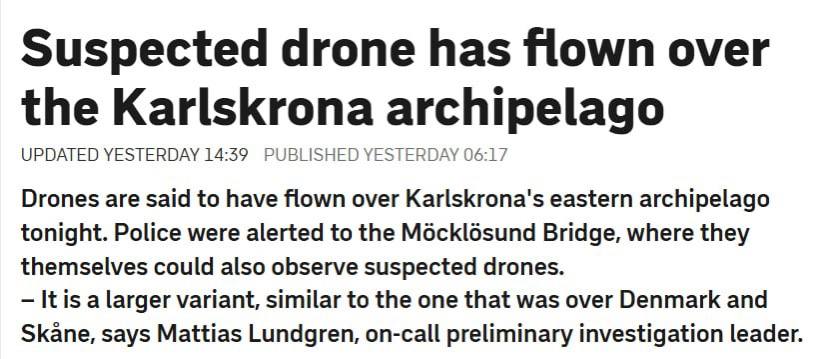 По информации издания, пролет подозрительных дронов зафиксирован в небе над архипелагом Карлскруна в Швеции, где расположена главная база Военно-морских сил страны.