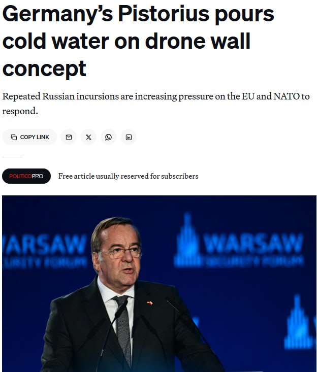 Министр обороны Германии Борис Писториус выразил сомнения по поводу концепции создания "стены из дронов", которая должна защищать восточные страны от российских воздушных вторжений. Этот проект активно продвигает Европейская комиссия.