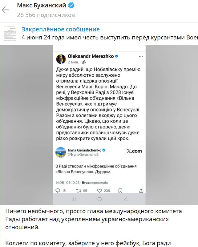 На фоне возмущения Белого дома тем, что президент США Дональд Трамп не получил Нобелевскую премию мира, глава Комитета Верховной Рады по международным делам и народный депутат от "Слуги народа" Александр Мережко поделился своей радостью, что премию получила венесуэльская оппозиционерка Мария Корине Мачадо.