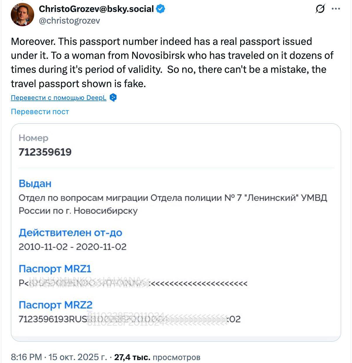 Однако у Труханова, по данным Грозева, действительно были два российских паспорта, выданные в 2004 и 2011 годах. В 2019 году кто-то использовал его паспорт, чтобы взять микрокредит на 5 тысяч рублей от его имени (скорее всего, мошенник). Также в 2019 году кто-то использовал номер этого паспорта, чтобы путешествовать на поезде под другим именем.
