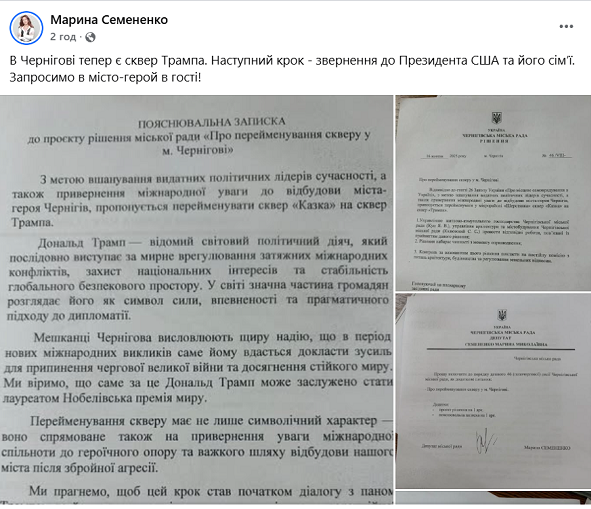 "С целью чествования выдающихся политических лидеров современности, а также привлечения международного внимания к восстановлению города-героя Чернигов предлагается переименовать сквер "Сказка" в сквер Трампа.