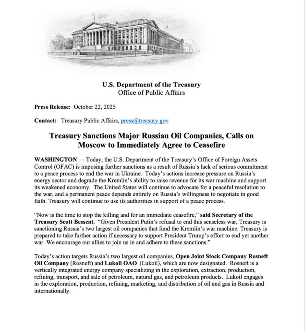 Все активы и имущественные интересы "Роснефти" и "Лукойла", находящиеся в США или под контролем американских лиц, блокируются. Любые операции с участием этих компаний запрещены для граждан и юридических лиц США, а также для всех транзакций, проходящих через американскую финансовую систему (отметим, что один из крупнейших покупателей российской нефти - Индия - платит за топливо в юанях).
