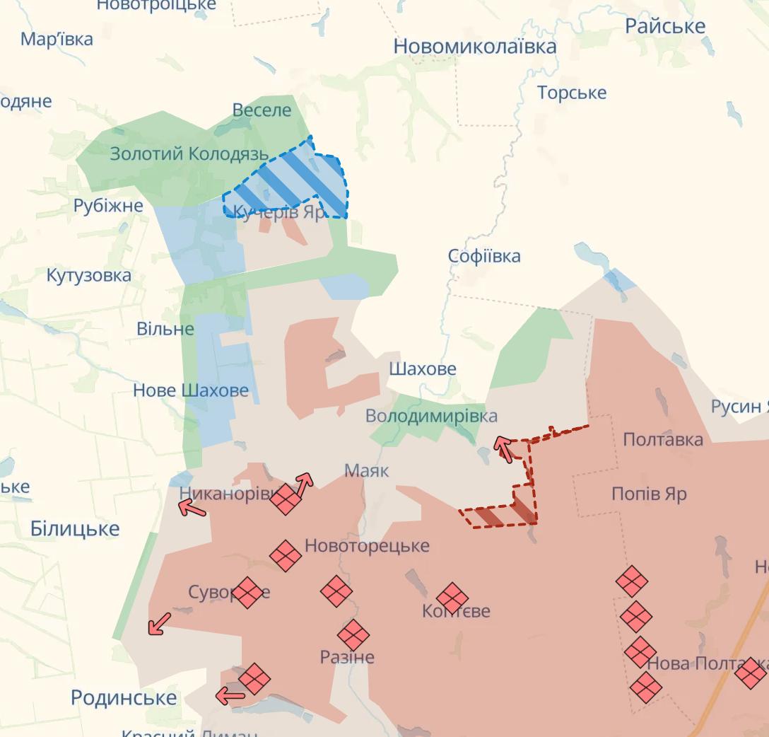 Кроме того, в РФ сообщают о захвате Першотравневого в Днепропетровской области на правом берегу реки Янчур. На карте Deep State оно указано под контролем ВСУ.