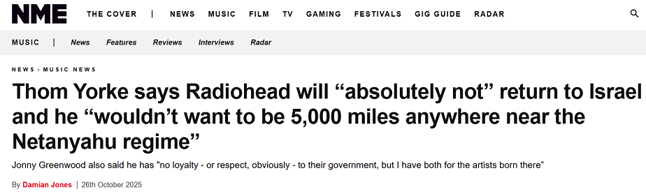 Музыкант подчеркнул, что не будет гастролировать в Израиле, пока у власти находится премьер-министр Биньямин Нетаньяху, при этом отметив уважение к позиции гитариста Джонни Гринвуда, который женат на израильской художнице.