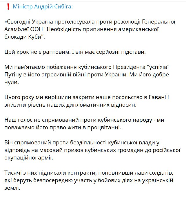 "Мы помним пожелания кубинского президента "успехов" пути в его агрессивной войне против Украины", – добавил Сибига.