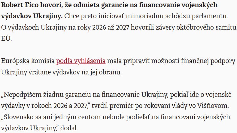 "Я не подпишу никакой гарантии по финансированию Украины, что касается военных расходов в 2026 и 2027 годах. Словакия ни одним центом не будет участвовать в финансировании военных расходов Украины", - сказал Фицо.
