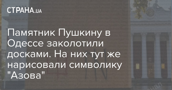 Памятник Пушкину в Одессе заколотили досками. На них тут же нарисовали символику "Азова"