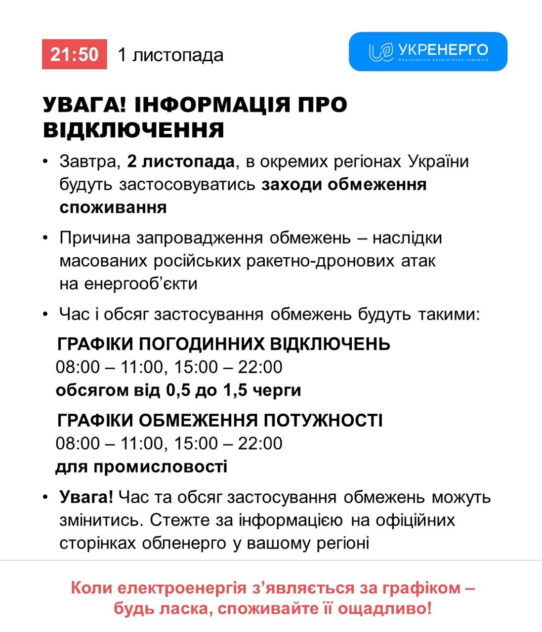 22:01 Завтра, 2 ноября, в отдельных регионах Украины будут продолжаться отключения света, сообщает "Укрэнерго".