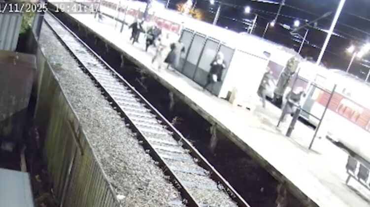 На опубликованных кадрах можно заметить, как группа пассажиров бежит по железнодорожной станции, а вооружённый ножом мужчина преследует толпу людей.