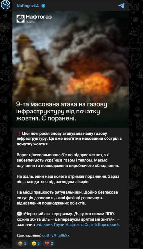 10:59 НАК "Нафтогаз" заявил о девятом с начала октября ударе по газовой инфраструктуре.