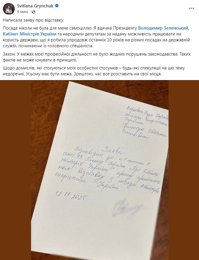 Гринчук написала заявление об увольнении с поста министра энергетики и отрицает, что ночевала у Галущенко