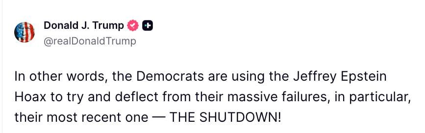 "Демократы используют историю с Джеффри Эпштейном, чтобы попытаться отвлечь внимание от своих масштабных провалов, особенно от последнего – приостановки работы правительства", – написал президент США в своей социальной сети Truth Social.