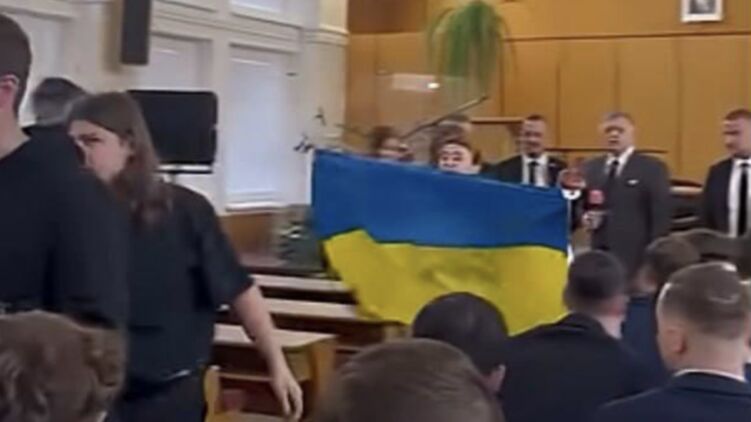 В ответ на это некоторые ученики начали шуметь и греметь ключами. Один из учеников развернул украинский флаг.