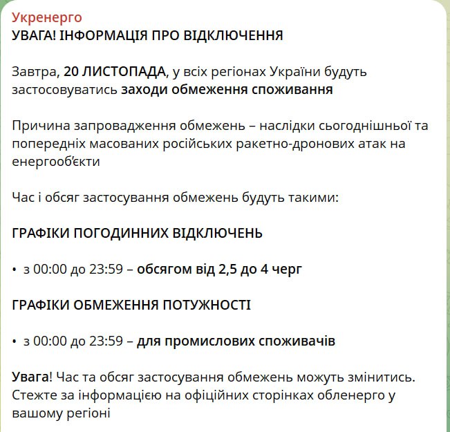 18.08 Отключения света завтра будут во всех регионах – круглосуточно в объеме от 2,5 до 4 очередей, сообщает "Укрэнерго".