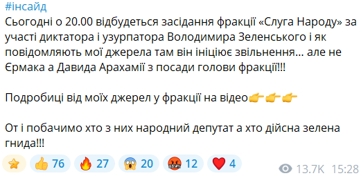 Между тем, как сообщает народный депутат Алексей Гончаренко, Арахамия поставил Зеленскому условие: уволить Ермака, чтобы Рада продолжила работу и сохранила монобольшинство. Требование Арахамии поддержали вице-премьер Михаил Федоров и глава ГУР Кирилл Буданов.