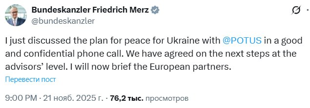"Я только что обсудил план мира для Украины с президентом США в хорошем и конфиденциальном телефонном разговоре". Мы договорились о дальнейших шагах на уровне советников. Я сейчас проинформирую европейских партнёров", - написал немецкий канцлер.