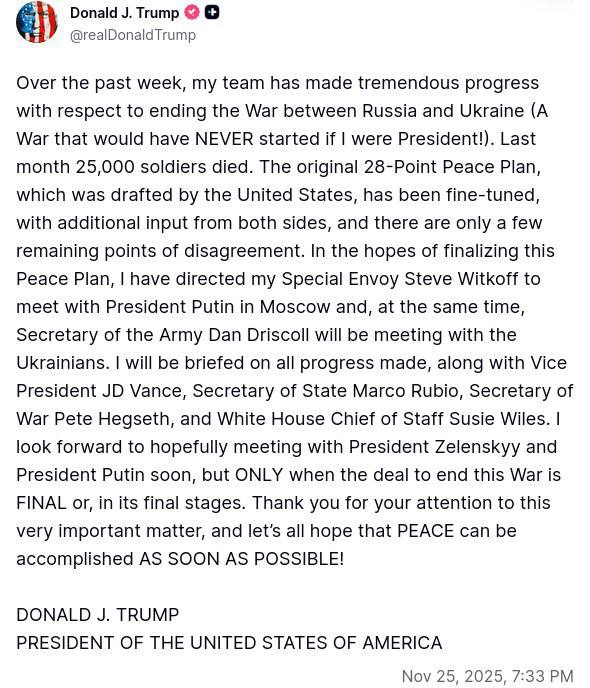 "За последнюю неделю моя команда добилась огромного прогресса в отношении прекращения войны между Россией и Украиной (война, которая никогда бы не началась, если бы я был президентом!). В прошлом месяце погибли 25 000 солдат. Первоначальный мирный план из 28 пунктов, который был разработан Соединенными Штатами, был доработан с дополнительным вкладом с обеих сторон, и осталось лишь несколько моментов разногласий. В надежде завершить мирный процесс я поручил своему специальному посланнику Стиву Уиткоффу встретиться с президентом Путиным в Москве, и в то же время министр армии Дэн Дрисколл встретится с украинцами. Я буду проинформирован обо всем достигнутом прогрессе вместе с вице-президентом Джей Ди Вэнсом, государственным секретарем Марко Рубио, военным министром Питом Хегсетом и начальником штаба Белого дома Сьюзи Уайлс. Я с нетерпением жду встречи с президентом Зеленским и президентом Путиным в ближайшее время, но только тогда, когда сделка о прекращении этой войны будет окончательной или на заключительной стадии. Спасибо за внимание к этому очень важному вопросу, и будем надеяться, что мир может быть достигнут как можно скорее!" – написал президент США в своей соцсети.