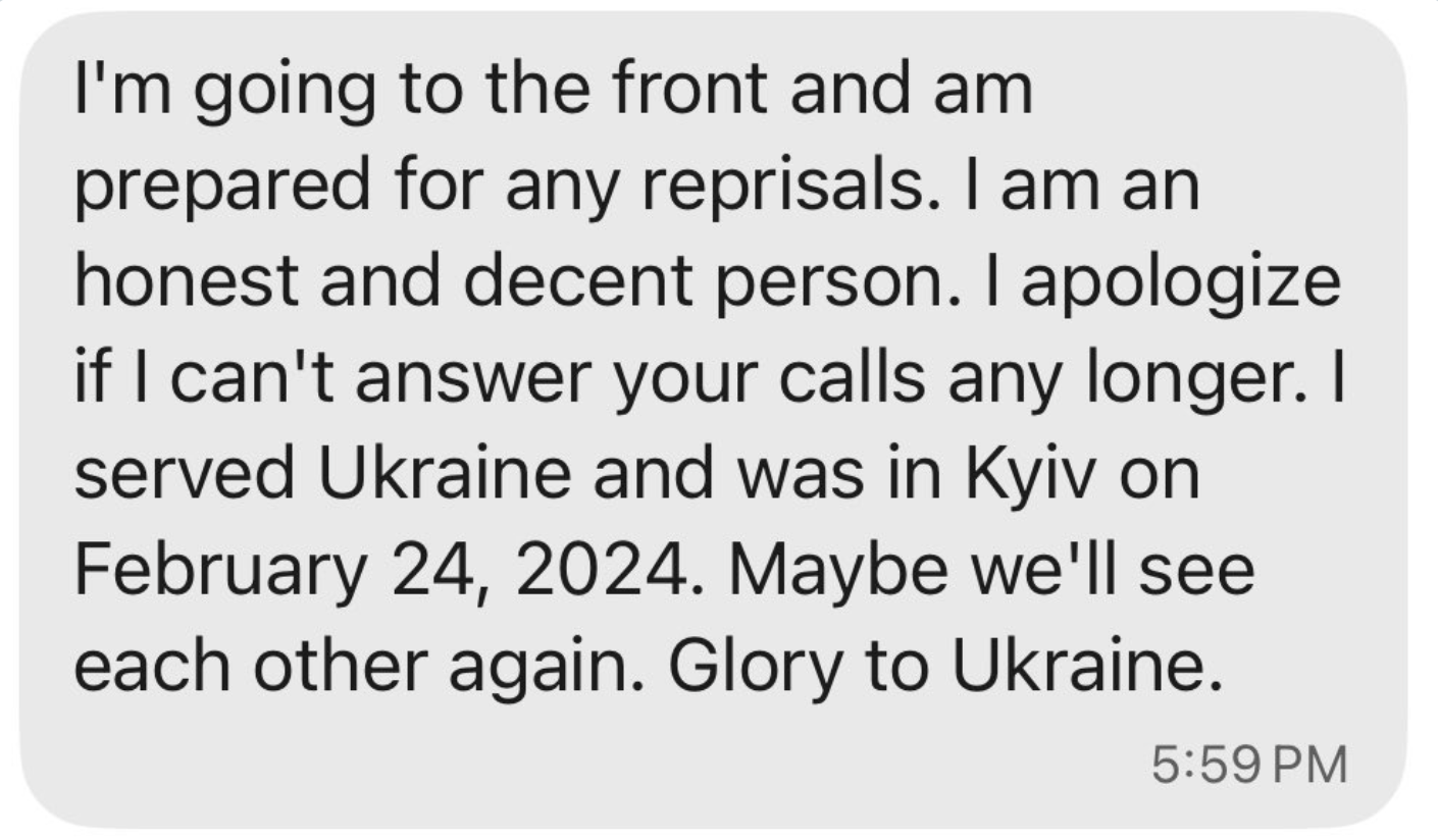 "Я отправляюсь на фронт и готов к любым репрессиям, - написал Андрей Ермак в текстовом сообщении изданию в пятницу вечером. - Я честный и порядочный человек".