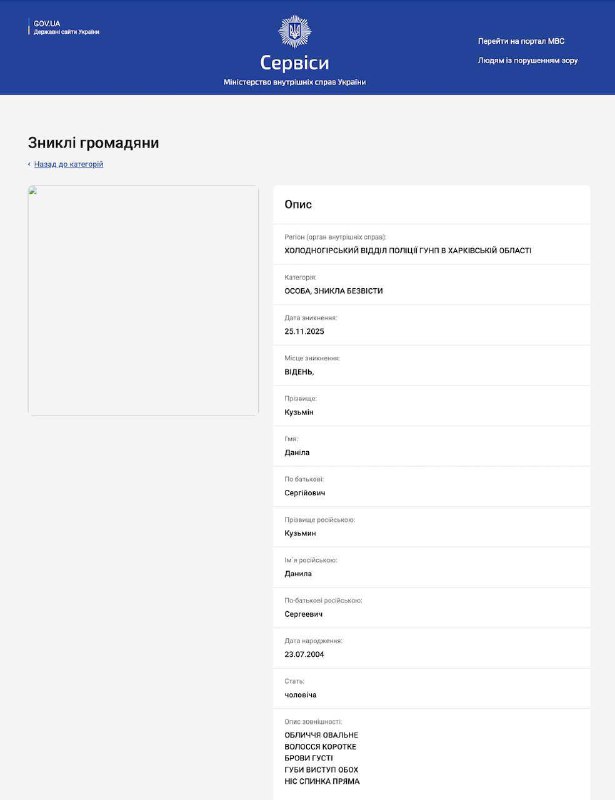 Об этом сообщил источник "Страны". Также на сайте МВД появилась карточка о розыске молодого человека, в которой указано, что он пропал без вести 25 ноября 2025 года в Вене.