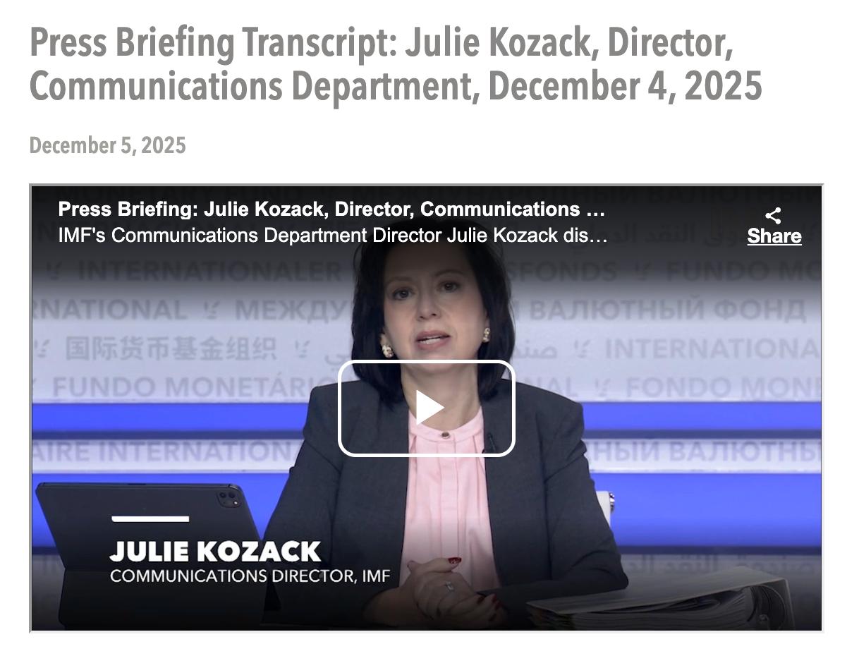 Пресс-секретарь Международного валютного фонда Джули Козак заявила, что одной из первоочередных условий для предоставление Киеву дальнейших кредитов было принятие государственного бюджета на 2026 годы, и оно уже выполнено. Предварительная оценка МВФ показывает, что документ в целом соответствует обязательствам программы.