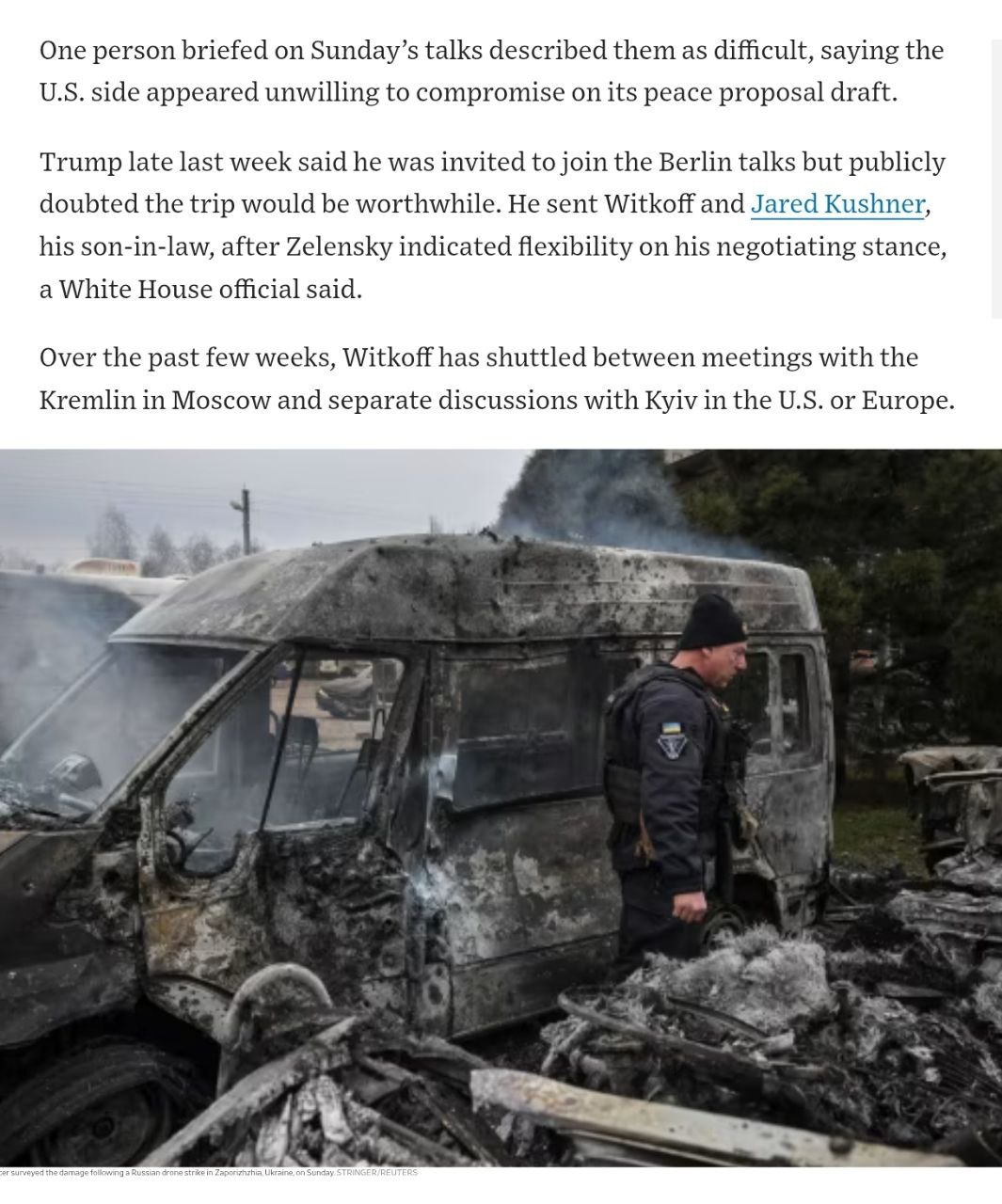 Соединенные Штаты на переговорах с президентом Украины Владимиром Зеленским в Берлине не идут на компромисс по своему проекту мирного соглашения.