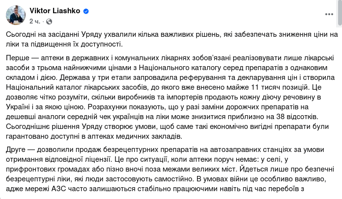 Об этом сообщил министр здравоохранения Виктор Ляшко на своей странице в Фейсбуке.