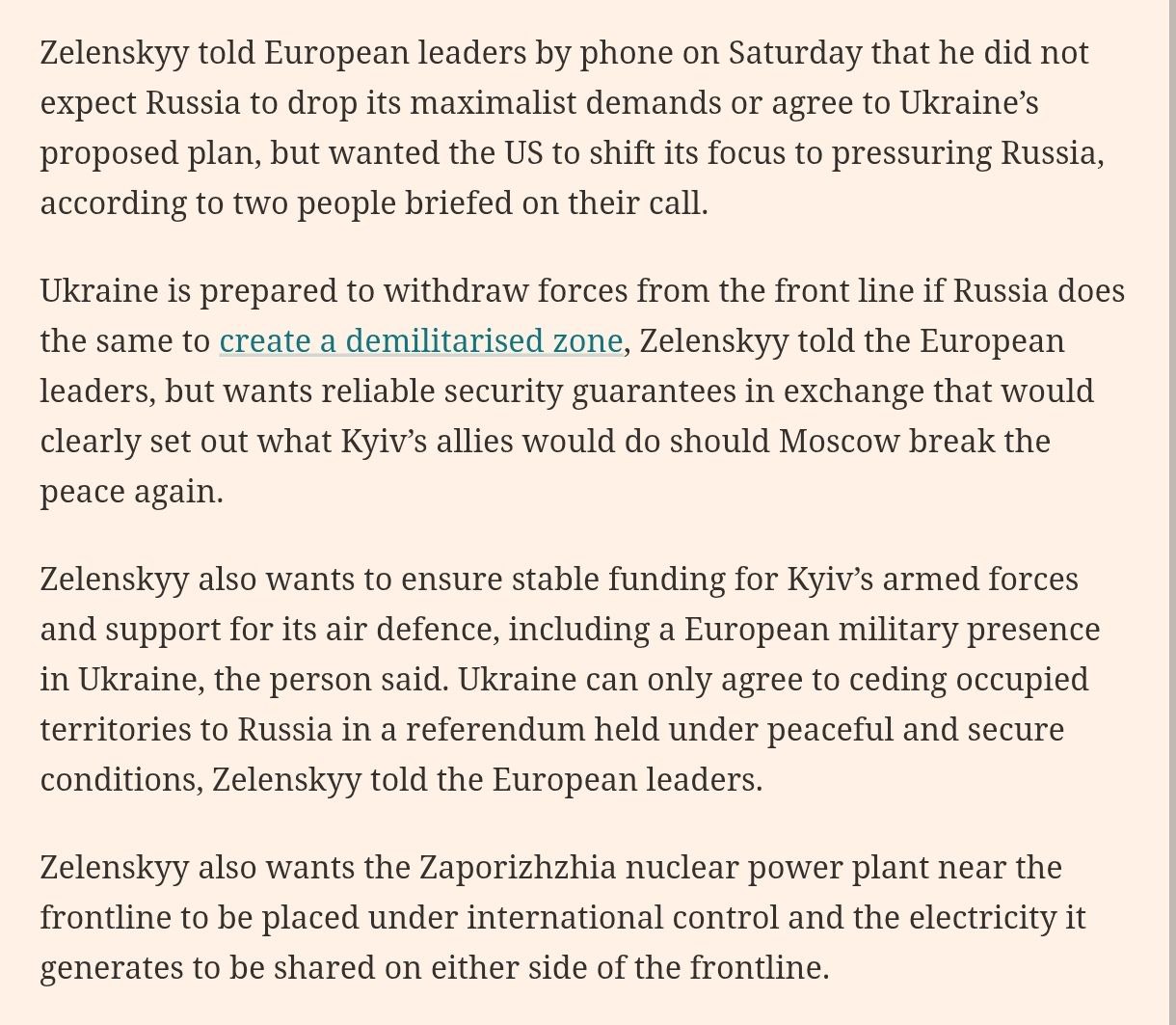 Зеленский, как он сам заявил европейцам, хотел бы, чтобы США переключили внимание на усиление давления против России. По его мнению, Путин своих максимальных требований не снимет (напомним, Москва, среди прочего, требует вывода ВСУ из Донбасса).